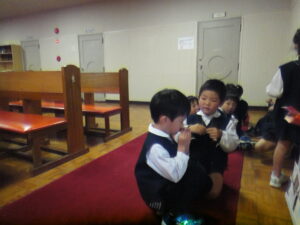11月15日、年長児が教会へ礼拝に行き七五三の祝福をしていただきました。