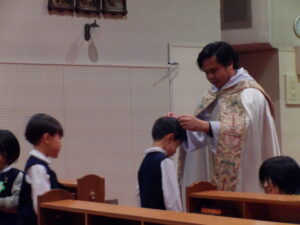 最後に神父様に聖水で祝福をしていただき、一人ずつマリア様が刻まれたメダイをかけていただきました。
