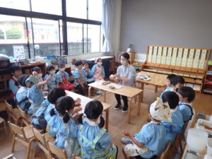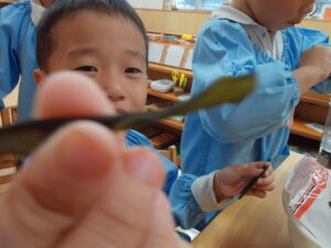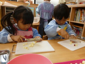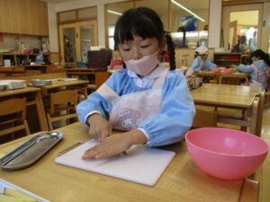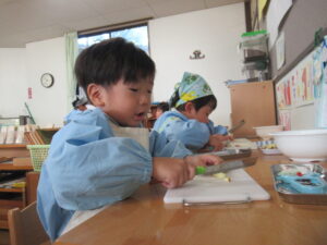 「○○ちゃんや、○○くん(年少さん)もこのくらいの大きさだったら食べられるかなあ。」