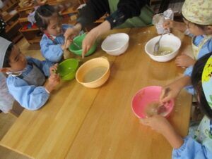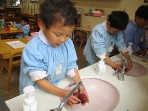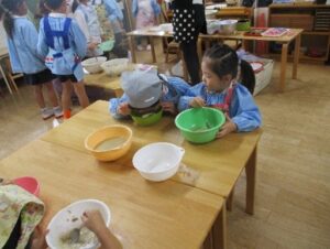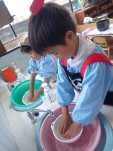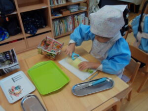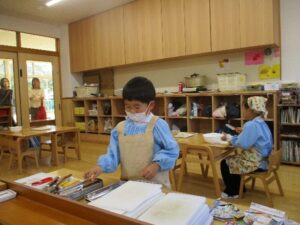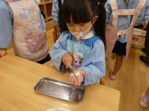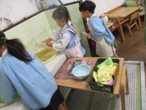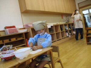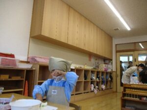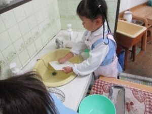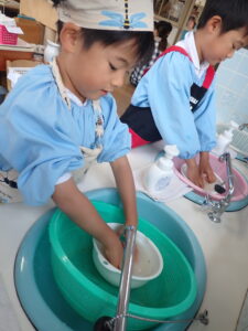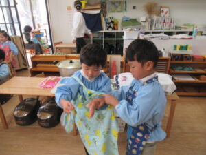 手洗いをして、エプロンを付けます。