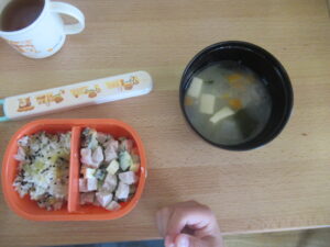 今日のメニューのお芋ご飯、コロコロサラダ、お味噌汁です。