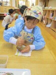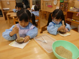 サラダの中に入れるごまを擦る子。