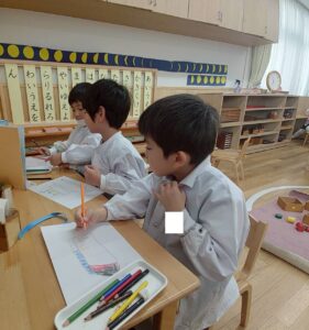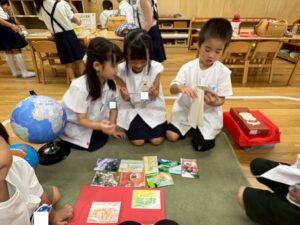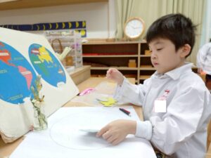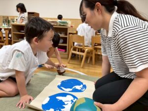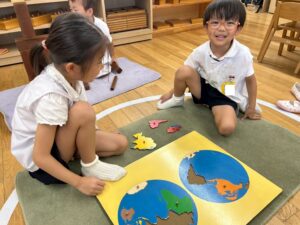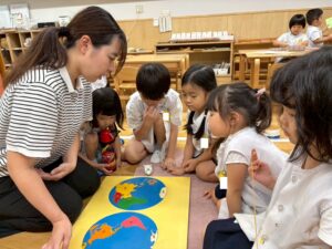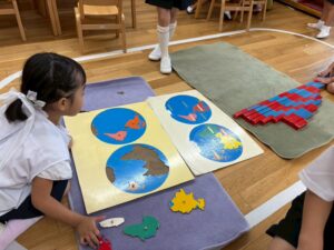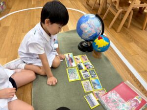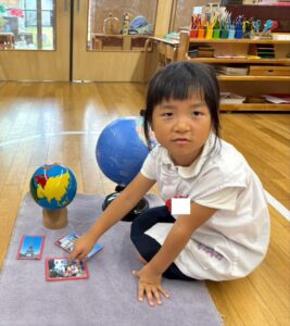 2学期に入り、年長児は世界を知るお仕事に取り組んでいます。初めは、宇宙・地球の話から始まり、大陸ごとの写真フォルダーを見ながら世界についての知識を深めています。