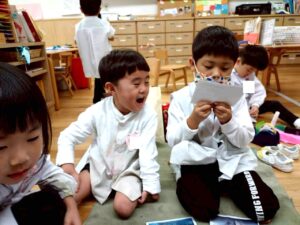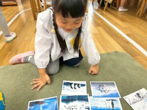 「南極の皇帝ペンギンは 〇〇君と同じくらいの高さがあるよ!」と言うと、年長児の男の子が立ってみんなに見せてくれました。子どもたちは「こんなにたかいの!!」「びっくり!」と驚いていました。
