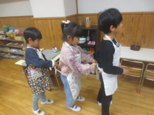 互いのエプロンの紐を結び合う微笑ましい姿が見られました。