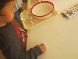 クレヨンが付き、汚れてしまった机を見て、困った顔の満3歳児さん。