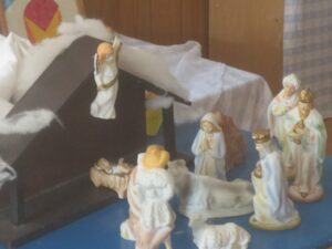 馬小屋に集まる人々や動物の置き物を飾ります。