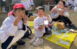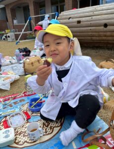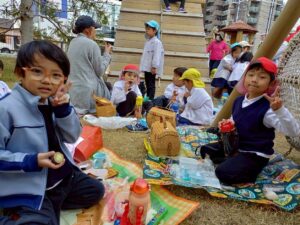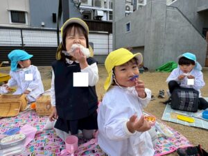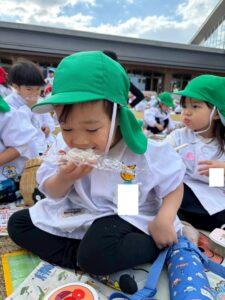 そして、全園児で園庭にレジャーシートを敷き、昼食を食べました。