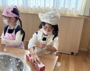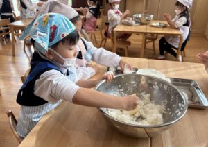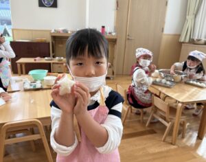 「おいしくな~れ!」「Cさんは、ちいさいおむすびがたべやすいかな」