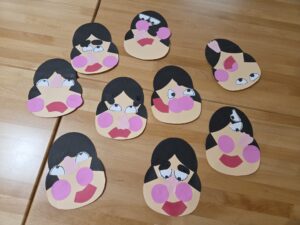 乳児さんは、福笑いの制作をしました。自分で考えて顔のパーツを貼って仕上げました。いろんな表情の福の神ができました♬