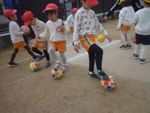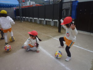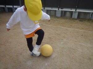 足でボールを転がしながら