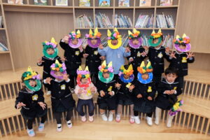 乳児さんも自分で作ったお面をかぶって写真撮影✨つばき組さんは、自分より小さいすみれ組さんを守る姿も見られました😭♡