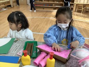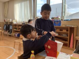 豆まきに向けて子どもたちは鬼のお面を製作しました。