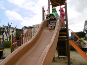 大きな滑り台を滑ったり鯉を見たりと、先生やお友だちと一緒時間いっぱい遊びつくしました!!