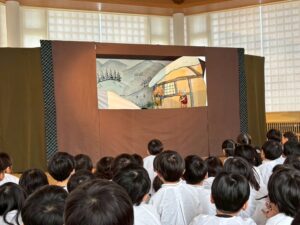 やさしいおじいさんとおばあさん、そしてお地蔵さまのお話に、子どもたちはすぐに引き込まれていました。雪の中でお地蔵さまに笠をかぶせてあげる場面では、真剣な表情で見入る姿も見られました。