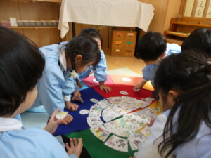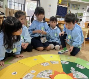 旬の食べ物や花、生き物、催し物が書かれたカードを見て