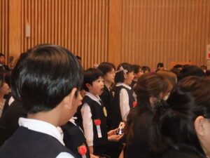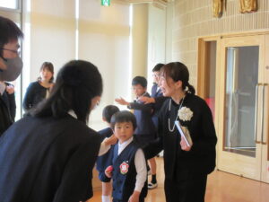 赤いリボンを、一人ひとりの胸に担任の先生からつけてもらい