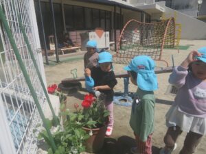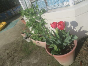 園庭のチューリップも咲き始め、えんどう豆もぐんぐん成長しています。