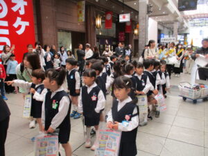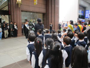 たくさんの人の中で、初めはドキドキし歩くのが精一杯でしたが、だんだんと慣れてくると道行く人やお店の人に「すみませ~ん」と自ら歩み寄り、「こうつうじこにあわないようにしてください」と言葉を添え、チラシを手渡していました。