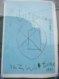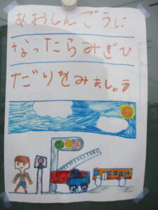 年度末頃には、町の人たちにも交通安全のことを伝えたいとポスターを描いた子、すると「ぼくもかく!」「わたしも!」とたくさんのポスターができました。