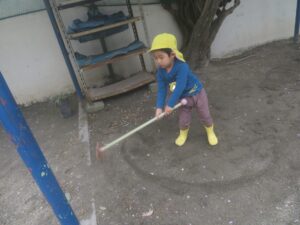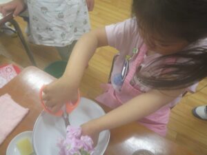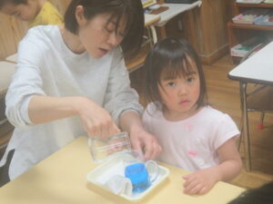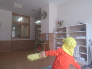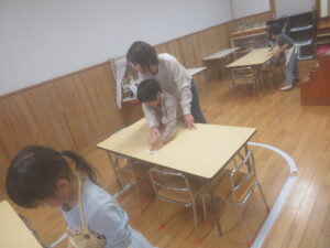 初めての当番活動なので先生や年長さんに教えてもらいながら