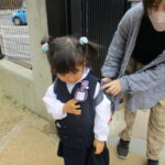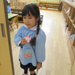 おうちの方に手を引かれながらやってきた年少児さん。