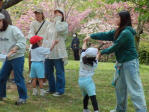 公園の花々が家族と手をつないで集まる子どもたちを出迎えます。