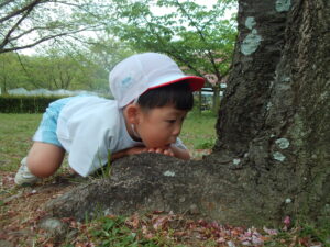 公園に咲いている小さな花や根の元からでてきた虫にくぎづけ。