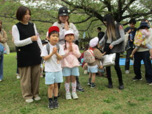今年度、初めて全園児、保護者が集まった今日の遠足。先生たちも自己紹介をしてごあいさつ。