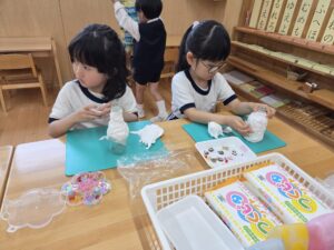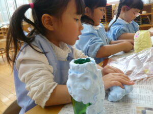 年長さんは年少さんと同じ紙粘土ですが、自分で色を付けて混ぜてこねて、それぞれ思い思いに持ってきていただいた瓶に貼っていきました。