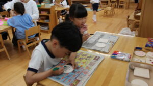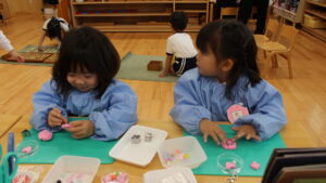 年少さんは紙粘土をくりぬいて、ビーズを埋め込みました。