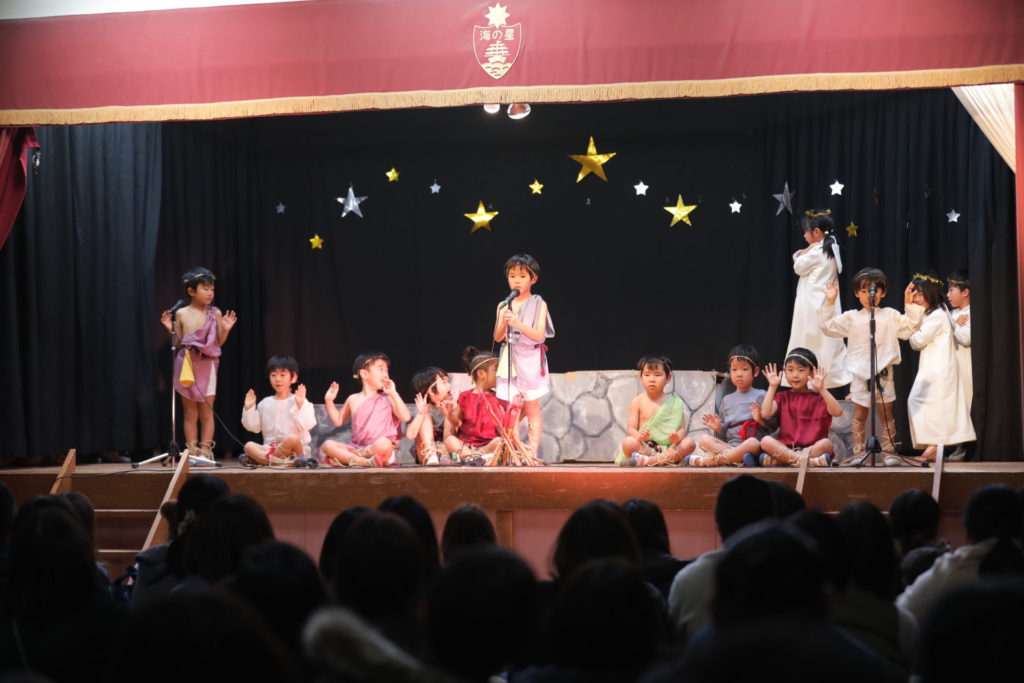 練習が始まり、セリフを覚えたり役を演じたりするのが難しく、不安げな表情を浮かべる子どももいましたが友達がセリフに詰まると一緒に言ってあげたり、「〇〇ちゃん大丈夫?」と声をかけてあげる子ども達の姿がありました。そして友達が上手くできると「〇〇ちゃん今日とっても上手だったよ。」と自分の事のように喜ぶ姿。こうして皆が助け合い認め合って進めてきたクリスマス練習。
