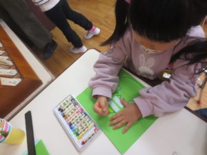 年長さんは、紙袋に目や鼻・口を付けて、大きい鬼の完成です!