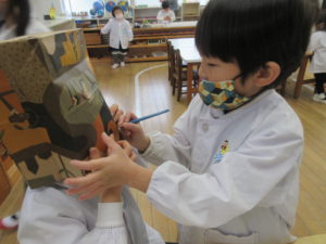 好きな色の絵の具で、鬼の顔を塗ったり、1つ1つのパーツがずれないように、丁寧に糊で貼ったりする姿がありました。