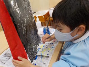 ばら組さんも、鬼の顔が印刷された画用紙に、思い思い色を塗り、鬼の面を作っていきます。