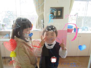 子どもたちが、園舎への感謝の気持ちや、絵などを思い思いに床や窓にかきました。