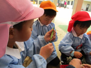 幼稚園で育てていたスナップエンドウがたくさんできたので、子どもたちと一緒に収穫しました(^▽^)