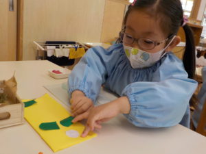 「むずかしそうだね。」「いっしょにやってみよう!」とお友だち同士で話し、難しいところや分からないところは聞き合いながら製作を楽しんでいました。
