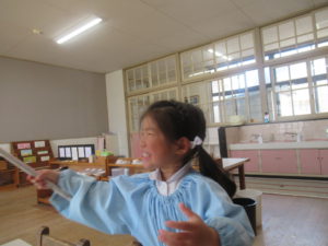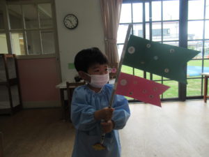 完成したこいのぼりを泳がせて「できた!できた!」と大喜び。