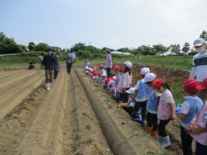 秋に掘りに行くさつまいもの苗植えに年長児が代表して行ってきました。
