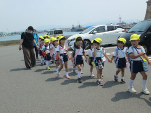 年少さんはお兄さんお姉さんと手を繋いで五色浜まで頑張って歩きます。