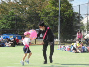 それにみたてて、保護者の方は頭にカゴを乗せて、子どもが投げたボールをキャッチする、その後遠ーーーーーくまで走って帰ってきてもらうという競技です。