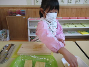 油揚げはさつまいもと違って柔らかくて切りやすいため、淡々と切っていく様子がありました。