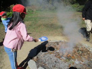 大昔はこんなたき火でご飯を炊いたり、料理をしたりしていたのだと思うと便利になったなぁと子どもたちの大変そうな姿を見て、改めて感じました。